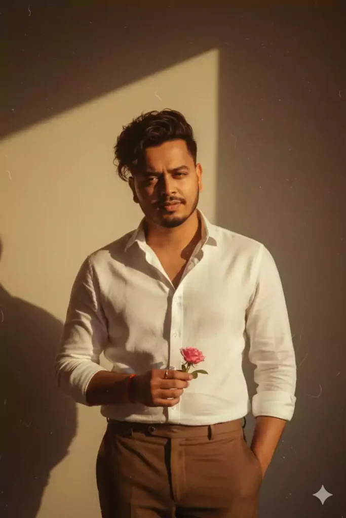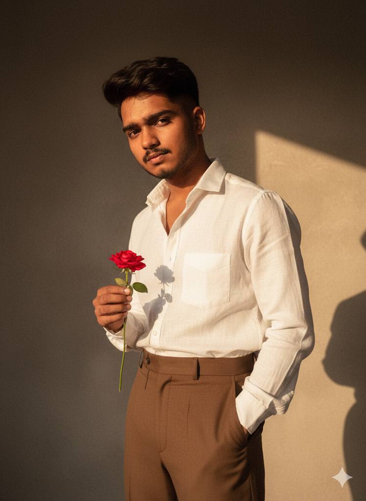 Prompt :-Using the reference picture, create a vintage, grainy, yet bright image with a 90s movie aesthetic. Dress the boy in a crisp, plain white linen shirt and tailored brown pants, evoking a minimalist, 90s-inspired casual elegance. His hair should be short, wavy, and stylish-think tousled, voluminous waves with a slightly messy quiff, dark brown in color. He holds a small, bloomed rose delicately in one hand, adding a romantic touch. The scene is set in a windy environment, with the shirt subtly billowing and hair gently tousled. He stands against a minimalist, slightly textured solid wall, with deep shadows and high contrast creating a mysterious, artistic atmosphere. The lighting is warm, with golden tones evoking a golden hour glow. His expression is moody, calm, yet happy and introspective, capturing a cinematic, introspective vibe.