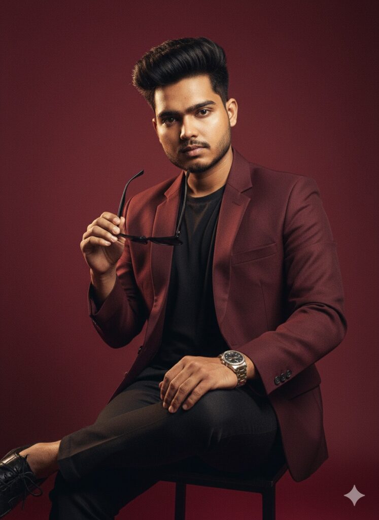 prompt: Ultra-realistic full-body editorial portrait in 8K, 9:16 format. The stylish young man with the same face as the reference image, looking directly at the camera, with perfectly styled voluminous hair.Casually seated on an invisible chair or low step, one leg forward and the other slightly to the side.One hand holding sunglasses slightly away from the face, the other hand relaxed. Confident, relaxed body language with a magazine editorial vibe.Wearing a deep maroon jacket over a black outfit, luxury wristwatch visible. Dramatic cinematic lighting enhances textures and facial details. Entire background is rich, uniform deep maroon, complementing his outfit. Magazine cover quality, hyper-detailed, ultra-sharp, realistic shadows and reflections. –ar 9:16 –style raw –u 6