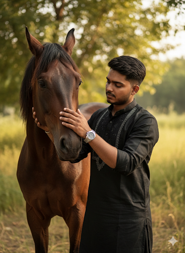 Prompt :- “A stylish man stands beside a dark brown horse, gently caressing its face with affection. He is wearing a black pathani sute ith a silver wristwatch visible on his wrist. His expression is calm and focused, showing a strong bond with the horse. The background is softly blurred with green trees and natural daylight, giving the scene a cinematic and warm atmosphere.”