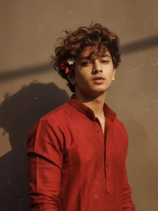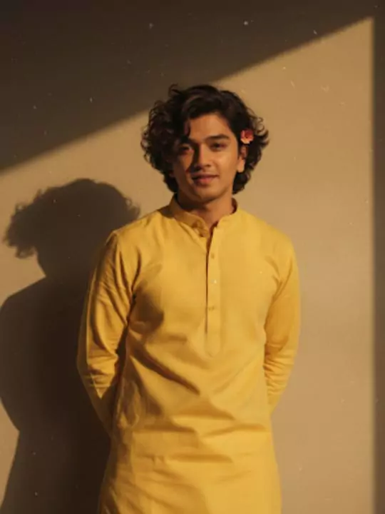 Prompt :-Create a retro vintage grainy but bright image of the reference picture but draped in a perfect plain kurta yellow color Pinteresty aesthetic retro kurta. It must feel like a 90s movie dark brown wavy curly hair with a small flower tucked visibly into his curls and romanticising windy environment. The boy is standing against a solid wall deep shadows and contrast drama, creating a mysterious and artistic atmosphere where the lighting is warm with a golden tones of evoking a sunset or golden hour glow. The background is minimalist and slightly textured the expression on his face is moody, calm yet happy and introspective.