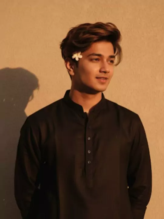 Prompt :-Create a retro vintage grainy but bright image of the reference picture but dressed in a perfect black color Pinterest’s aesthetic retro kurta. It must feel like a 90s movie brown-haired baddie with a small flower tucked visibly into his curls and romanticizing windy environment. The boy is standing against a solid wall, deep shadows and contrast drama, creating a mysterious and artistic atmosphere where the lighting is warm with golden tones evoking a sunset or golden hour glow. The background is minimalist and slightly textured, the expression on his face is moody, calm yet happy and introspective.