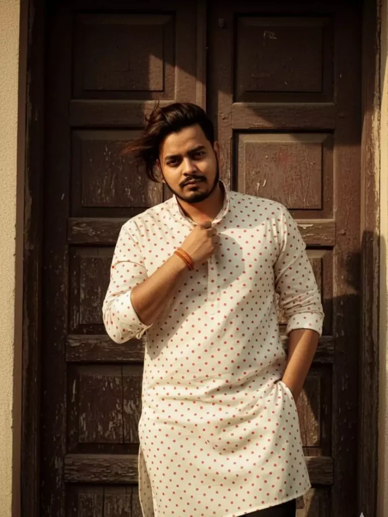 Prompt :- Create a retro, vintage-inspired image – grainy yet bright – based on the reference picture. The boy should be dressed in a perfect off-white cotton kurta with red polka dots on it, Pinterest-style aesthetic kurta. The vibe must capture the essence of a 90s movie dark-brown-haired baddie, with silky hair and a small flower tucked visibly into his hair, enhanced by a windy, romantic atmosphere. He stands against an old wooden door, where deep shadows and dramatic contrasts add mystery and artistry to the scene, creating a moody yet enchanting cinematic effect. Make a pose like he is adjusting his kurta.