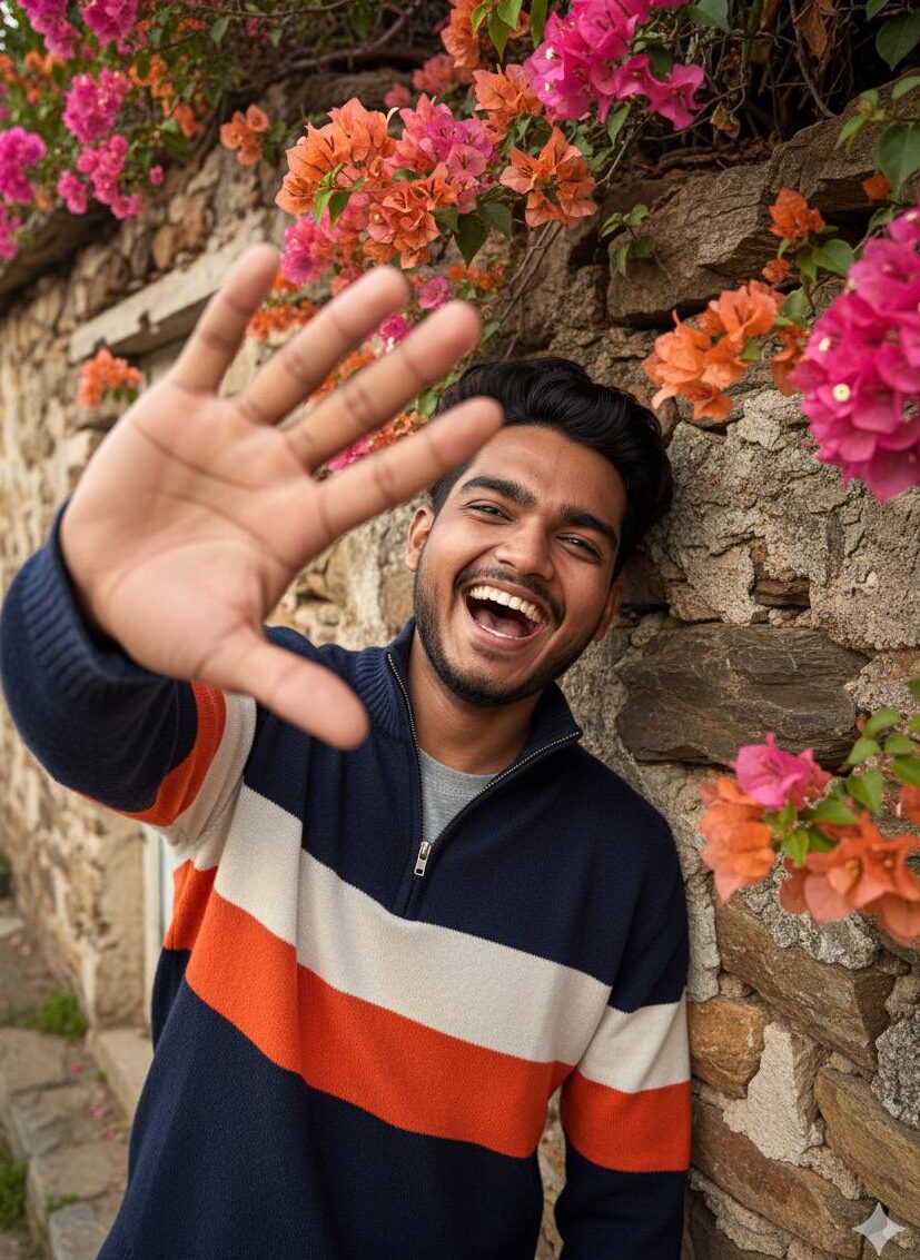 A hyper-realistic overhead 9:16 closeup of a young man [Using the uploaded picture exactly face] leaning on colorful flowering vines by an old rocky cottage wall at pink hour. He laughs, raising one hand to block the camera, wearing a modern colorblock half-zip wool sweater over a crewneck, tousled wavy hair, sharp focus, warm cinematic color grading, 8K detail.