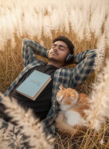 Prompt :- Hyper-realistic low-angle vertical shot (9:16) of a young man lying in a white long feathery plant field. He wears a modern check shirt over black tee, arms bent under his head, eyes closed peacefully. Overhead headphones in curly hair, an upside-downbook ‘Love’ on his chest, and a persian cat tubby sleeping beside him. Warm light, floral foreground overlap,sharp 8K detail, cinematic color grading, soft shadows.