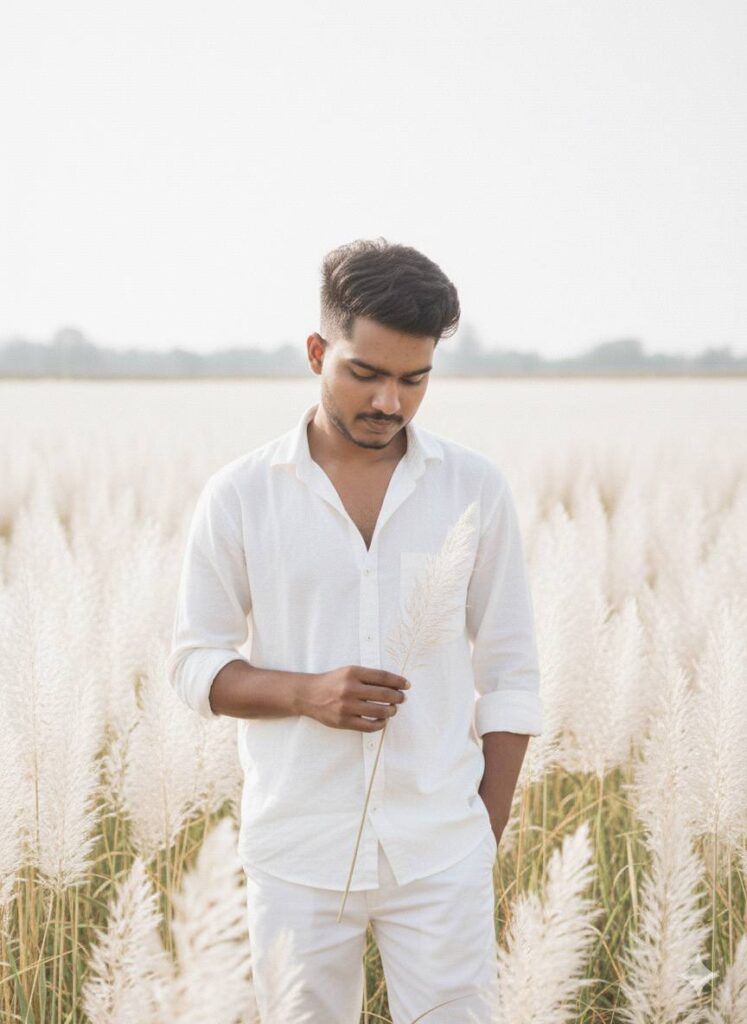 A stylish man(use my image for refrence with accurate face) standing in a field of white Kash/Kans grass, holding a bouquet of pampas grass, cinematic photography, natural soft light, Background white Sky realistic details, professional portrait, bokeh background, 8k ultra realistic, fashion pose, wearing white shirt and black pants, sunglasses, DSLR shot.”