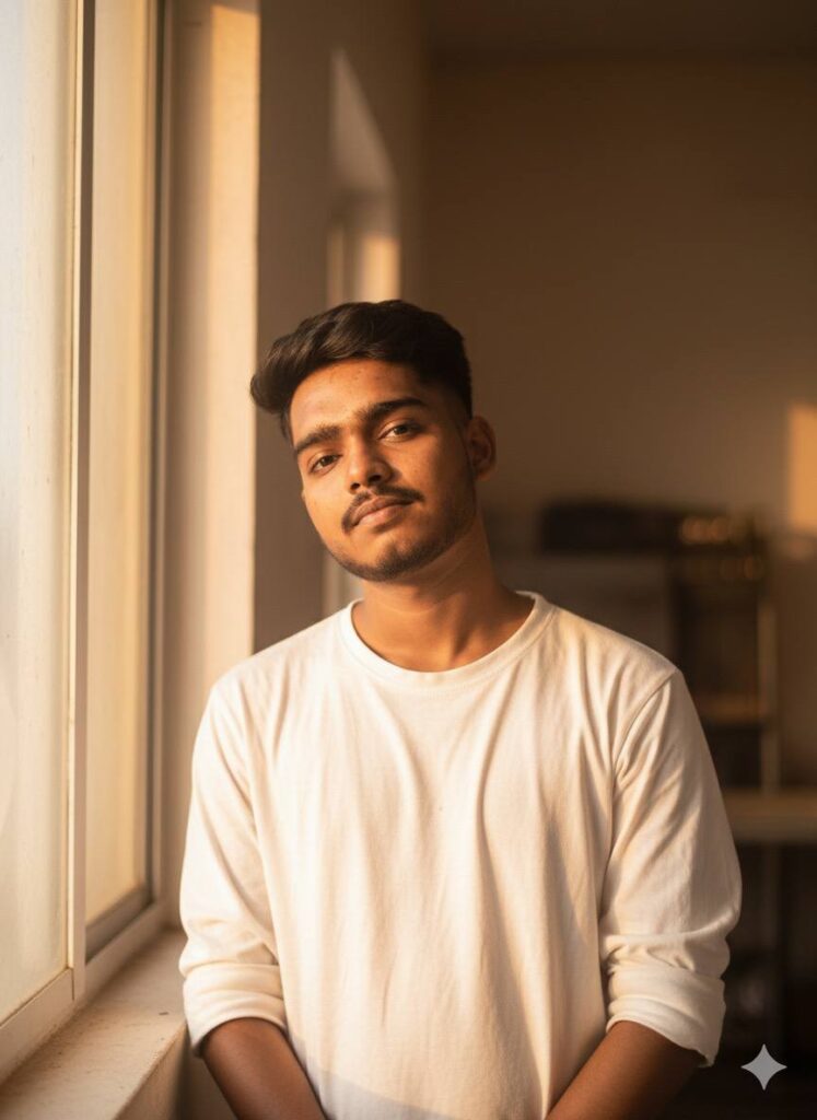 Prompt:-Create a softly lit portrait of the uploaded parson standing indoors near a window with warm sunlight streaming though.use a cinematic golden -hour lighting style that highlights the face and hair with natural glow and soft shadaws. The person should be wearing a loose casual white shirt white slightly rolled-up sleeves.the mood should feel calm dreamy and natural with soft depth of field and a warm intimate atmosphere