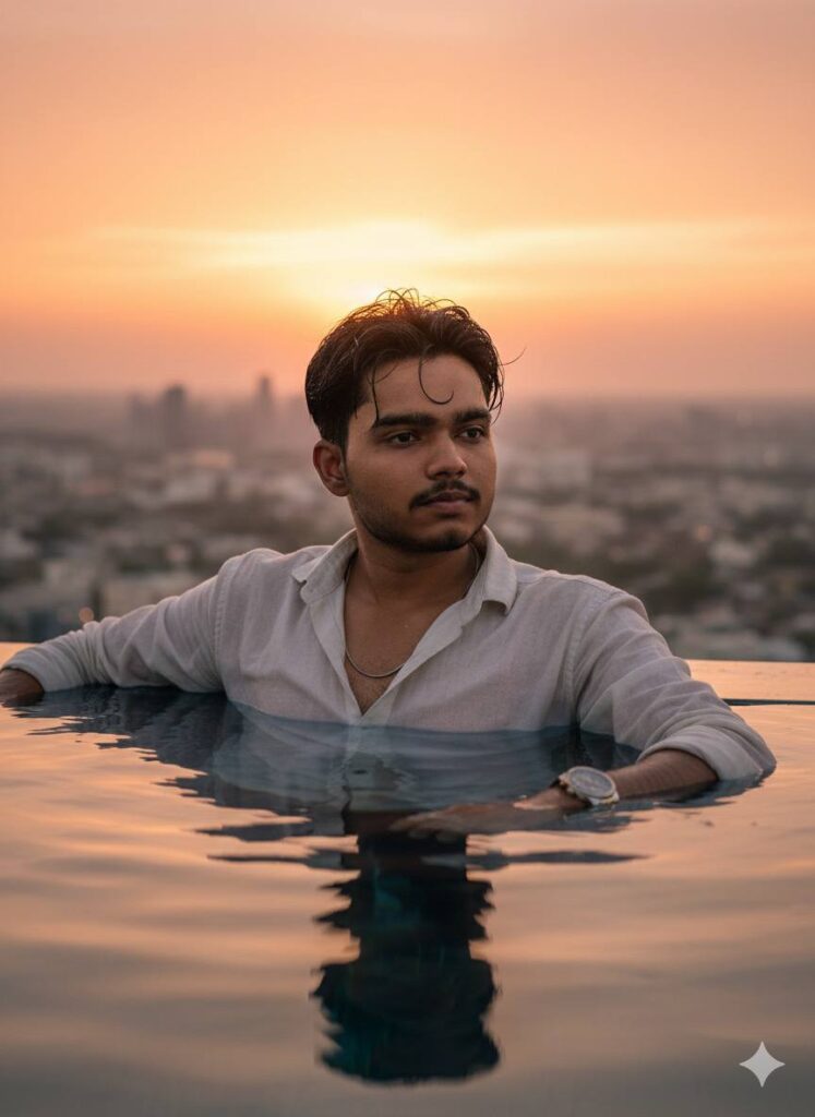 Prompt :- A photorealistic summer lifestyle portrait of a young man (use the uploaded reference photo for exact face, hairstyle, and skin tone). He is captured mid-action in a crystal-clear swimming pool, looking playfully confident at the camera while running one hand through his wet hair.