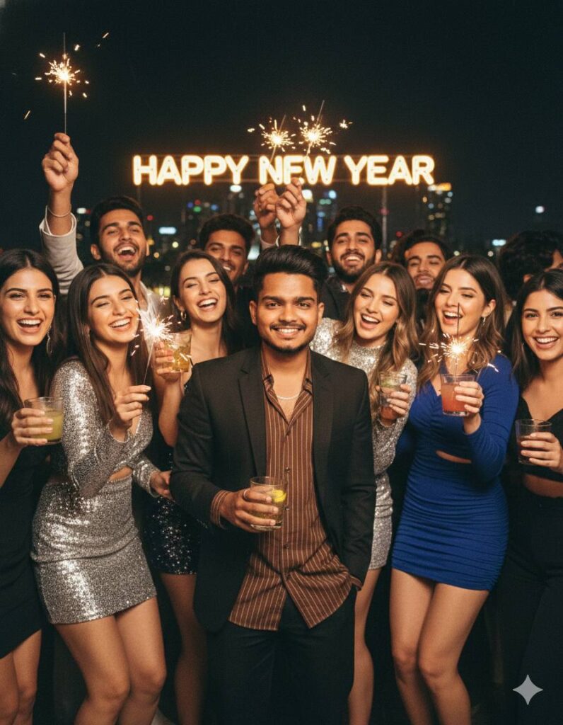 A candid, realistic photograph of a diverse group of friends, including aesthetic young women and men, celebrating loudly on a crowded rooftop bar at night. The main man (based on the reference photo’s face, hair, and beard) is in the center, looking directly at the camera with a natural, genuine smile, holding a glass of drink. He is wearing a relaxed dark black suit jacket, a brown striped button-down shirt, and a visible thin gold chain. He is surrounded by female friends in stylish, cute aesthetic party outfits (sequined dresses, fashionable tops) and other male friends, all laughing, hugging, and holding up lit sparklers and drinks. In the background, there are blurred city lights and large, glowing “HAPPY NEW YEAR” lights. The atmosphere is joyful and chaotic. Natural night lighting with warm glow from sparklers, authentic film grain texture, 8k resolution. –ar 3:4